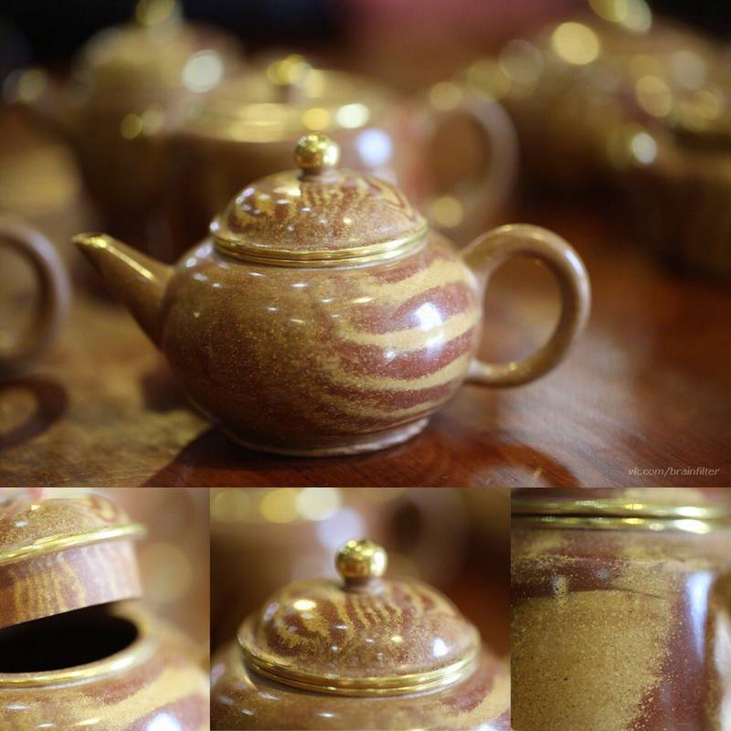 Помимо замечательных интересных чайников, выполненных в различных техниках, приехали чайники, совмещающие в себе сразу три оригинальных технологии - сырье "тяо ни" (смешанная глина, в данном случае - это дуань ни и цзы ни), полировка внешней поверхности до блеска, и украшение золотом!