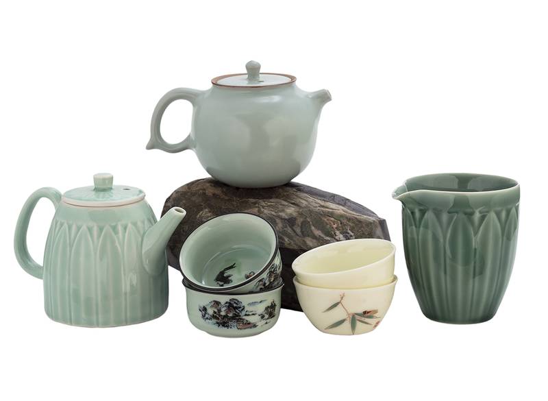 3. Набор посуды для чайной церемонии из 9 предметов # 41472, фарфор: Чайник 245 мл, гундаобэй 170 мл, сито, 6 пиал по 40 мл.